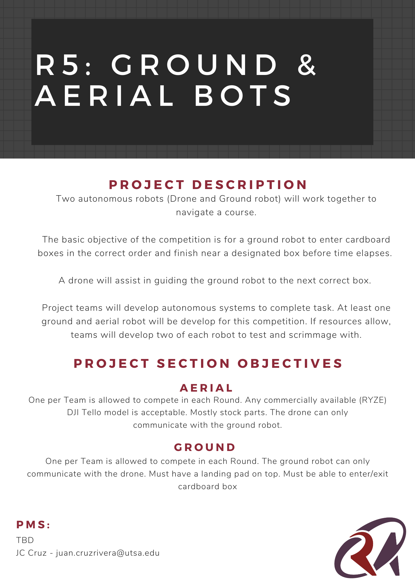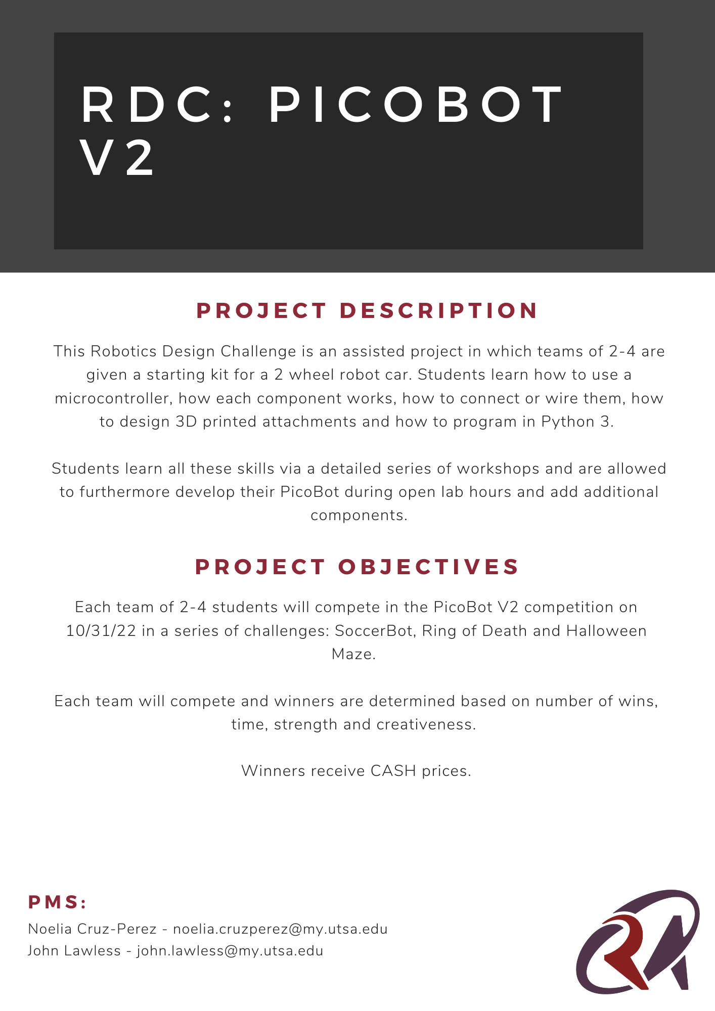 Hello! We are here to serve the UTSA community with workshops, projects and outreach events to get you the experience and contacts in robotics.